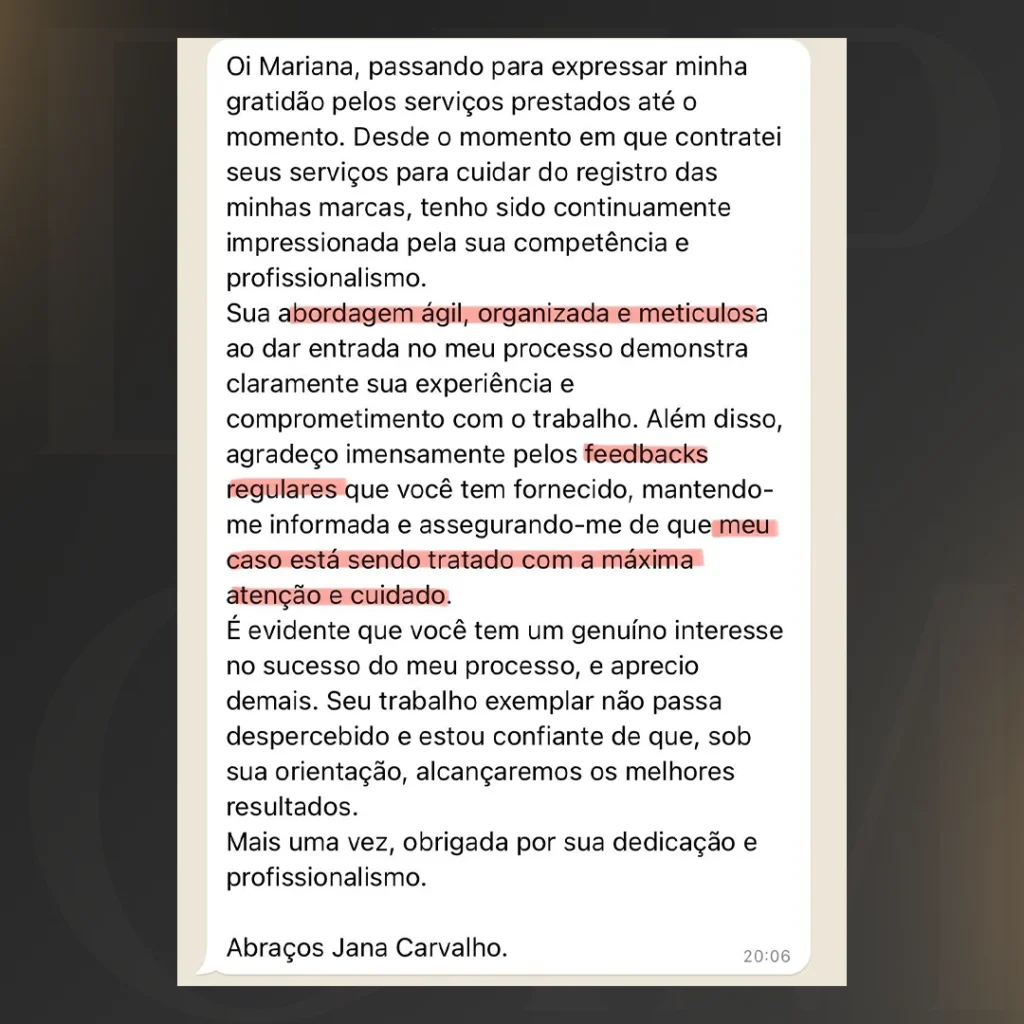 Sou Mariana Alves, advogada especialista em Direito Marcário e fundadora da Ziva Marcas. Com mais de 6 anos de atuação na área jurídica, minha missão é clara: proteger e gerir marcas de forma transparente e eficaz.